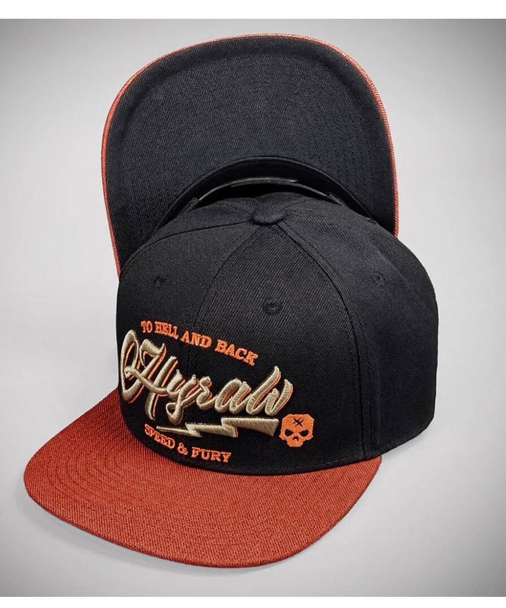 • mit flachem, ziegelrotem Schirm und grau-orangefarbener HYRAW-Schriftzugstickerei auf der Vorderseite