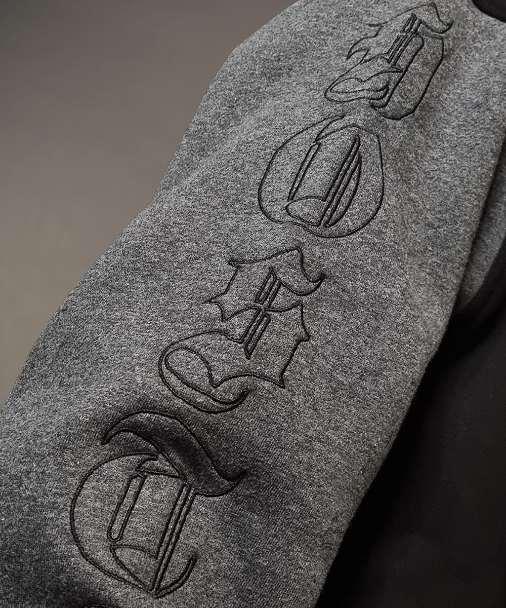 - Der gotische Schriftzug „HOSTILE“ ist auf dem rechten Ärmel gestickt