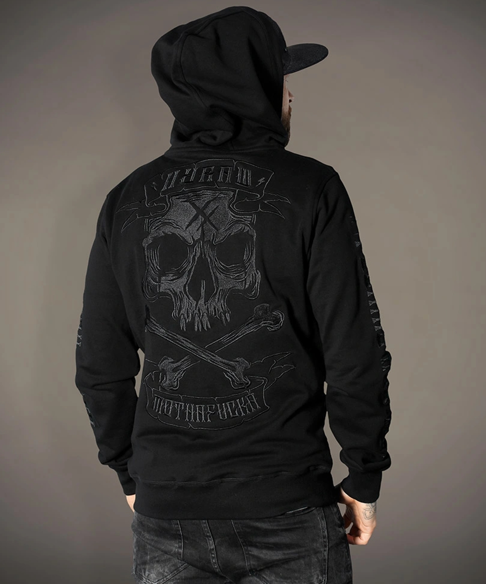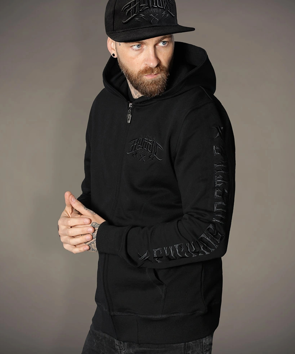 - Schwarze Kapuzenjacke mit Reißverschluss und schwarzer Stickerei