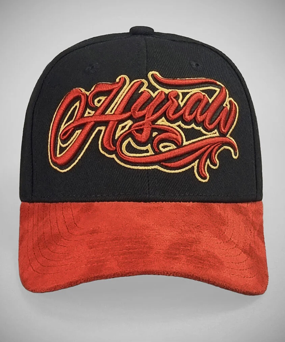 - gesticktem HYRAW-Logo in rotem Relief mit goldener Umrandung auf der Vorderseite