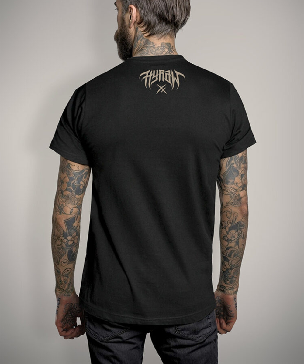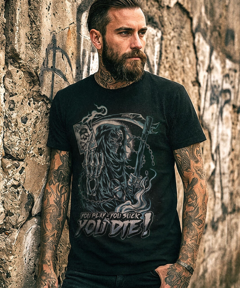 - Schwarzes T-Shirt mit zweifarbigem Aufdruck des Schriftzugs „YOU DIE“ auf der Vorderseite